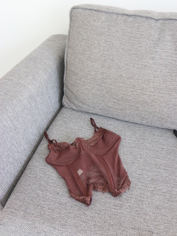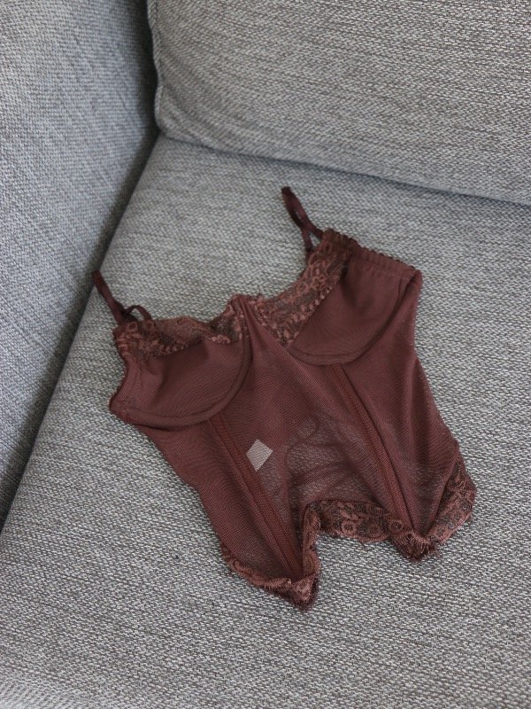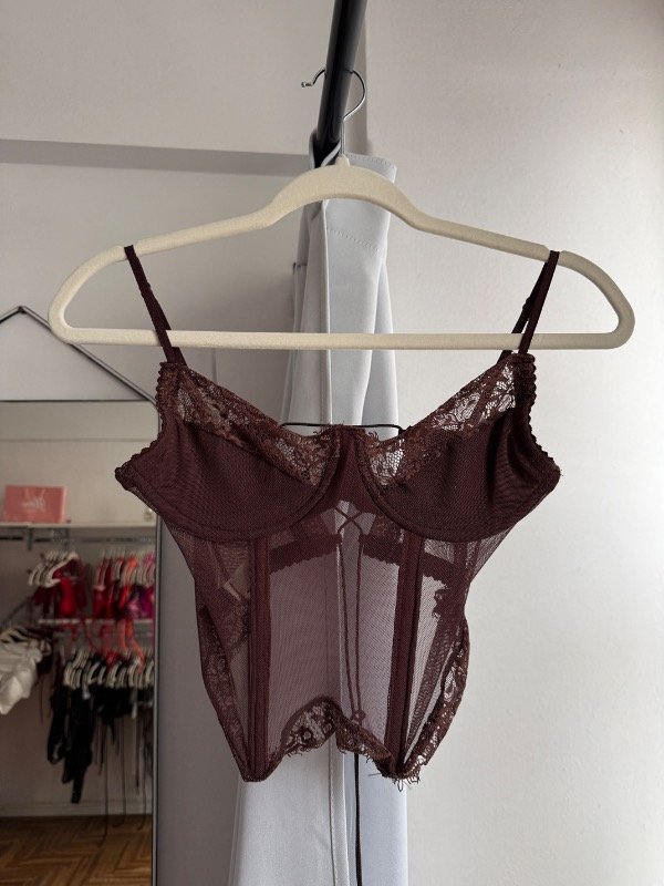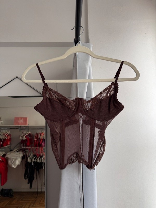 Corset con aro, forreria en busto, breteles regulables y espalda para atar. Diseñado en puntilla y microtul.