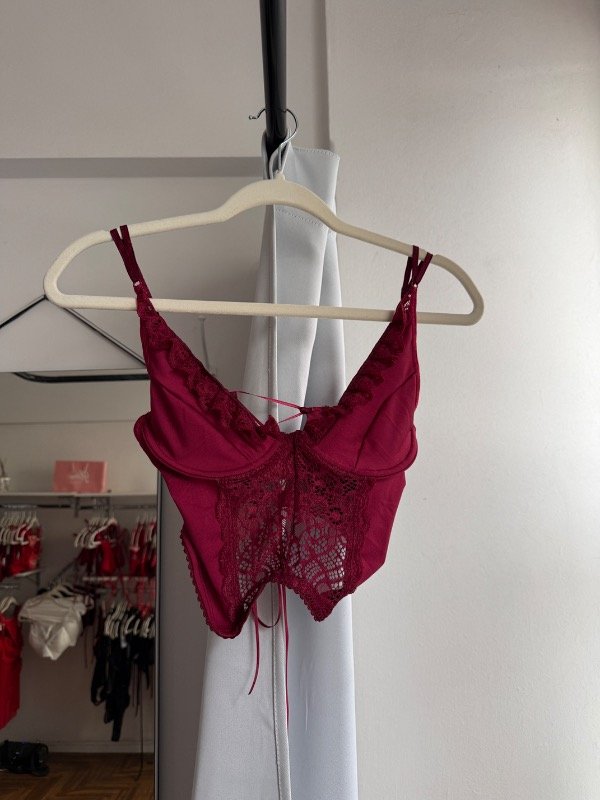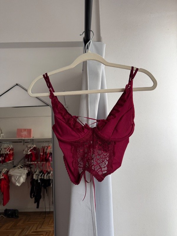 Corset con aro, forreria en busto, breteles regulables y espalda para atar. Diseñado en encaje y lycra.