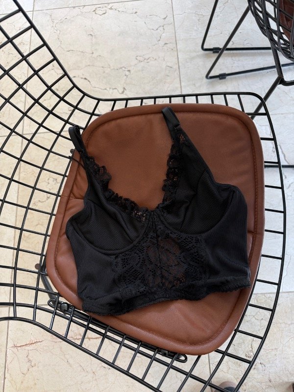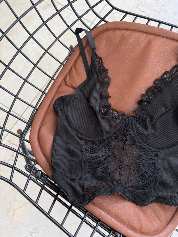 Corset con aro, forreria en busto, breteles regulables y espalda para atar. Diseñado en encaje y lycra.